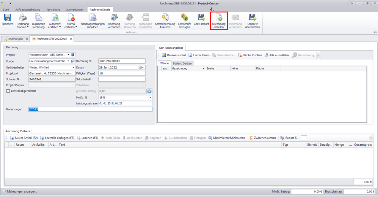 Klicken Sie im Aktionsmenü des neuen Reiters Rechnungs Details auf XRechnung erstellen.