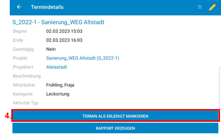 Tippen Sie auf die Schaltfläche TERMIN ALS ERLEDIGT MARKIEREN.